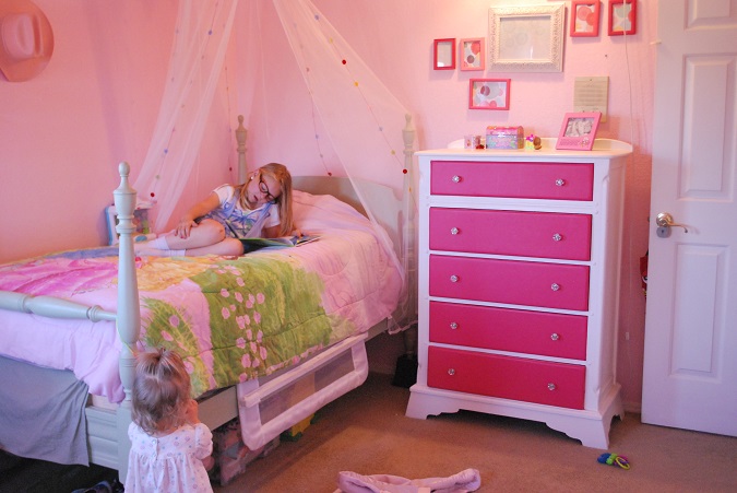 I shared a few weeks ago about my friend, Amanda, and her adorable boys’ room, with the boys having a several-year age difference. I’m back with Sarah, whose daughters share a room despite a five year age gap. This tour is adorable, girly, and full of great ideas for sharing a room. Enjoy!