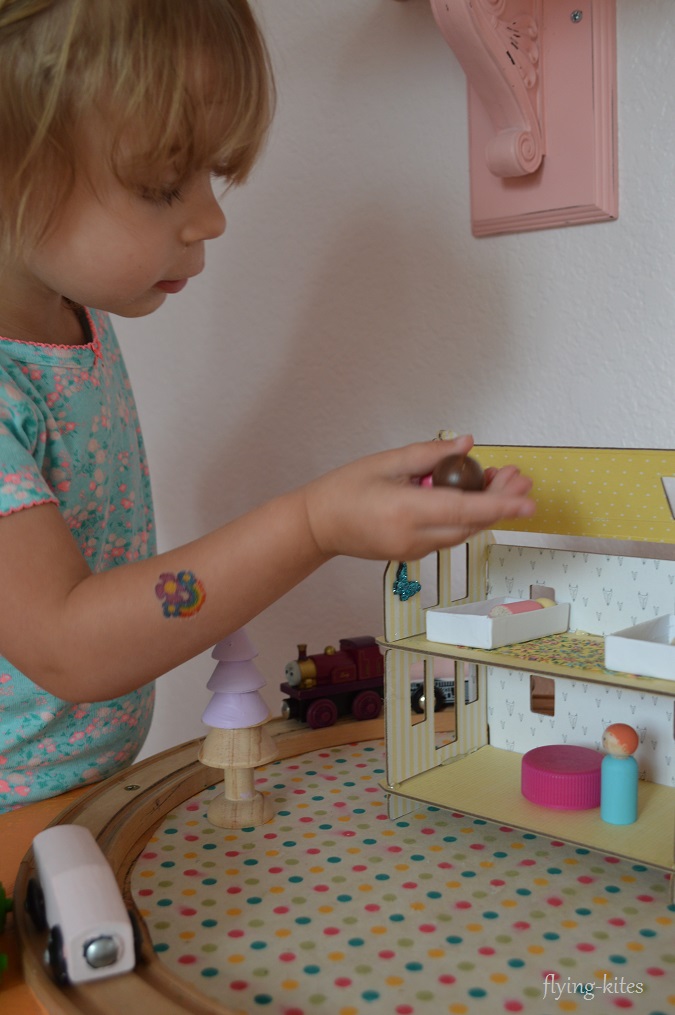 When I was creating my daughter’s train table, I wanted to add some houses to give the table a distinct “homey” feel. I purchased a little yellow house from them a year before {I don’t see it offered anymore} and then I ordered a cute pink house from Amazon.