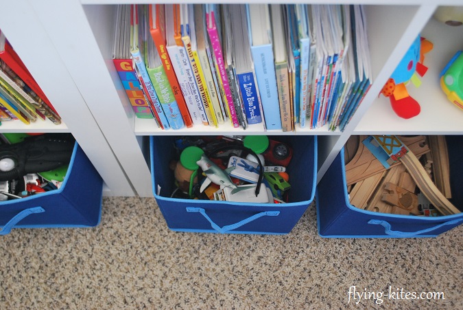 Keep it fun and simple. Since my two boys are four years apart, it is a huge age gap of what toys they both play with. But I created a place where each of them has a little cubby of toys just for them.