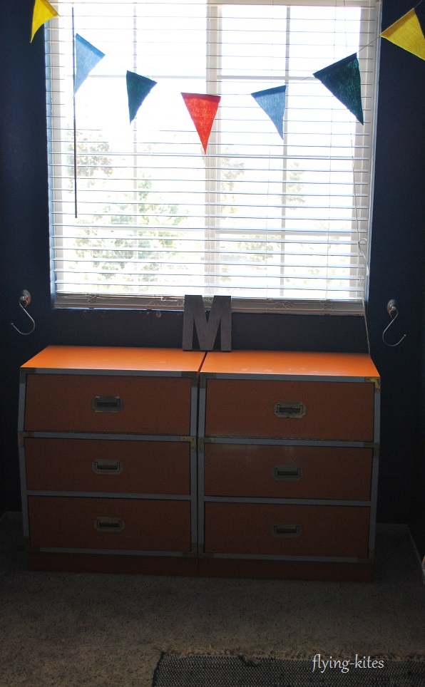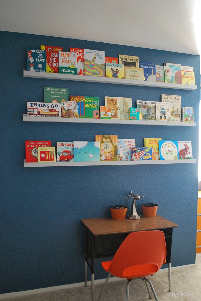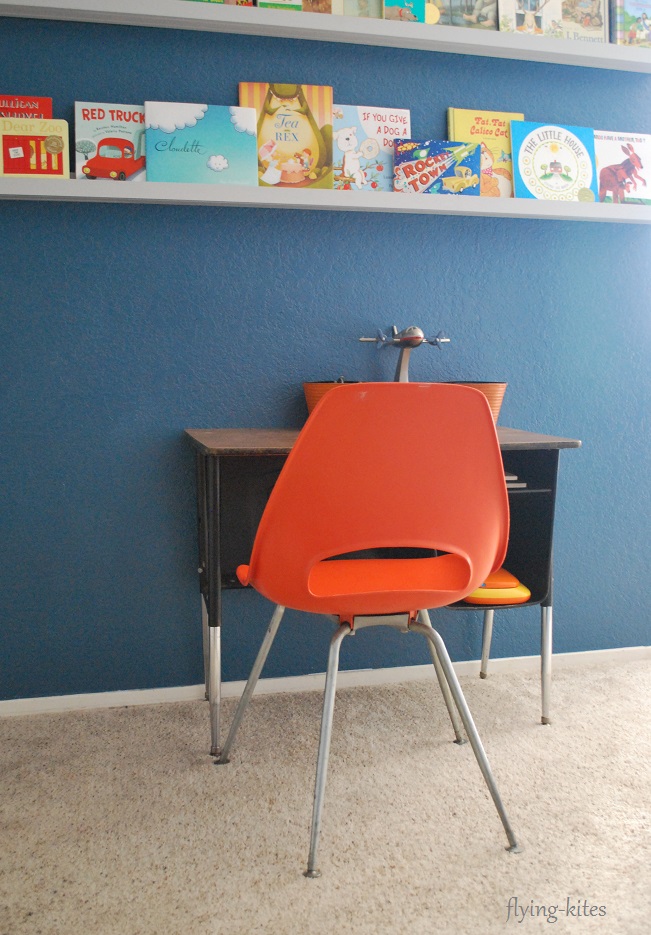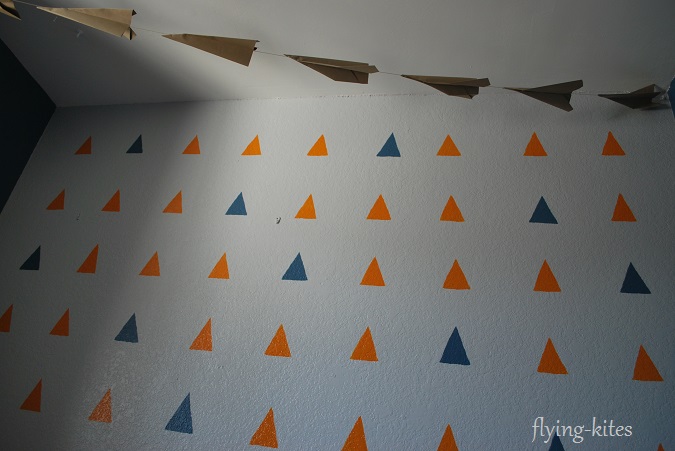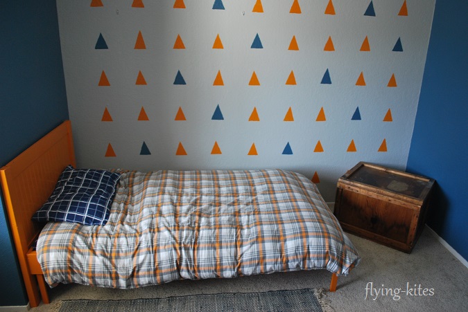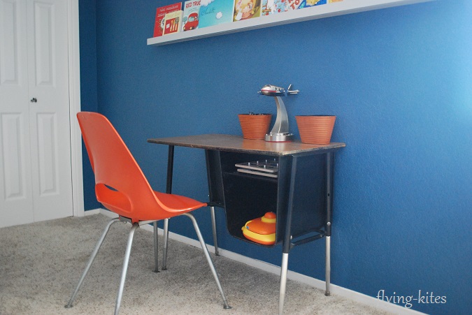 The triangle week was when everything came together and I completely rearranged his room and pulled in a couple new things, like a school desk and the orange chair. I also took away a few decorative airplanes.