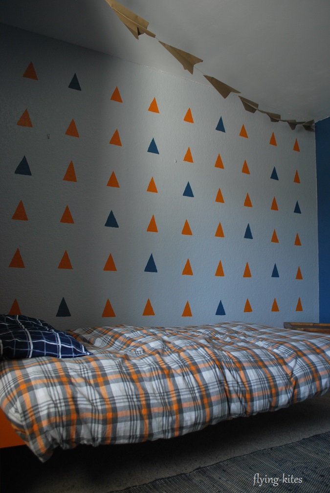 Then over a three-day weekend, we moved my son’s mattress into my daughter’s room while we did some major painting. In the room before, we had a thick red stripe near the ceiling, which we painted over and also painted the far wall gray for an accent wall. The bed, built by my husband, was red, so I painted it orange just like the campaign nightstand. The rest of the week, while my son was at preschool and my daughter napped, I turned on Netflix and painted orange and blue triangles all over the gray wall (and almost lost my mind).