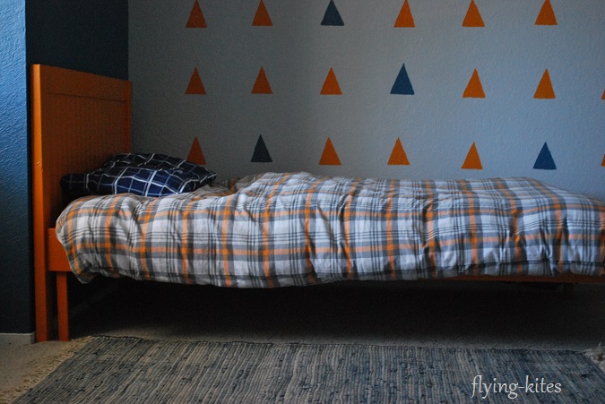 After months of searching, I couldn’t find a duvet in the right price range that worked with his room. But there was this orange and grey plaid duvet on clearance at Pottery Barn Kids I kept watching.