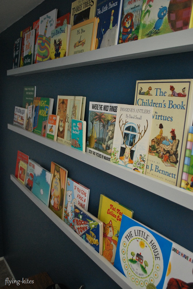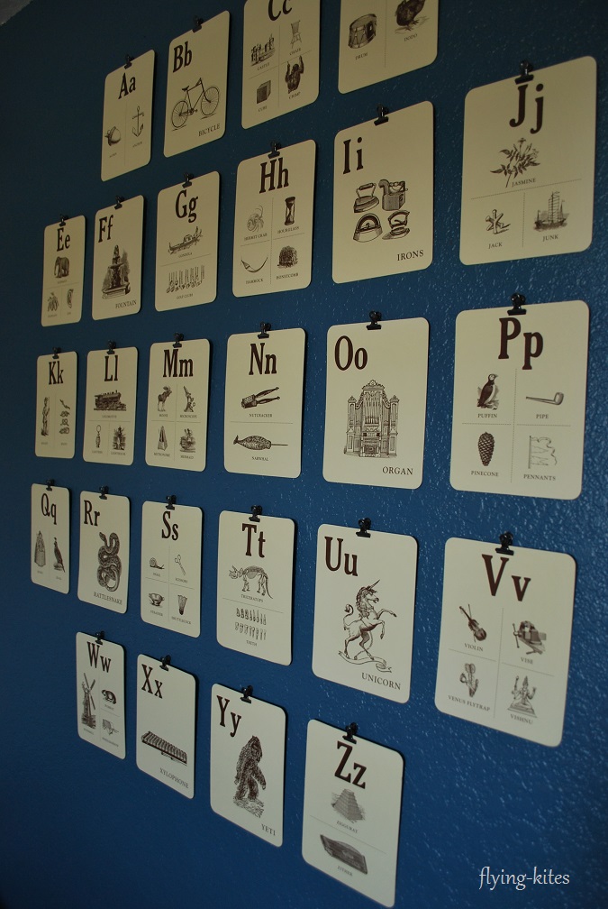 I also rearranged the vintage-inspired alphabet cards originally over the bed hanging precariously by putty. The cards are now across from the bed neatly hung by metal clips.