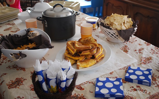 I used my dining room table to set up the food. I protected it with a tablecloth and then in the center, laid down art paper stamped with pumpkins since the food was pretty messy. I also set up a mirror-image buffet so the line could go down both sides at once. Keep the main larger dishes in the center (chili, soup, grilled cheese), duplicate the extras like chips and sour cream, and duplicate the plates, bowls, and utensils. Also, at the end of the line, put the utensils and extra napkins, so it is one less thing to balance while filling the plate.