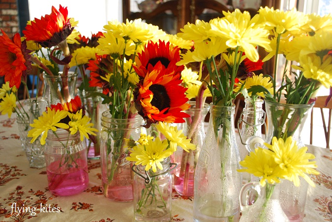 Pick up two or three bouquets of fall color flowers at the grocery store and place them in a bunch of mason jars or vintage bottles the night before. The vases of flowers can be lined up down the center of the table.