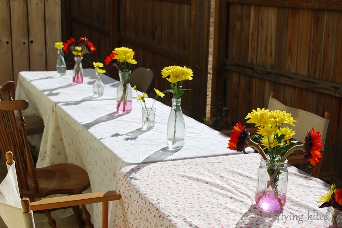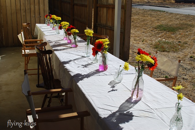 I borrowed folding tables from friends and my church, so I had a hodgepodge group that I lined up end to end to form a long table. To create a coheasive look, I used vintage sheets I had on hand (one per table) as tablecloths. Even though the sheets were all different, it helped that the backgrounds were neutral. I borrowed from all over my house and managed to come up with mismatched chairs that completed a homey, vintage look.