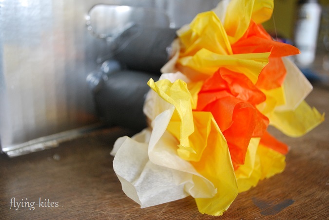 Cut each color of tissue paper in three pieces, make three bouquets using each color, and glue into the toilet paper rolls. I put orange in the center, followed by yellow, then white on outside.