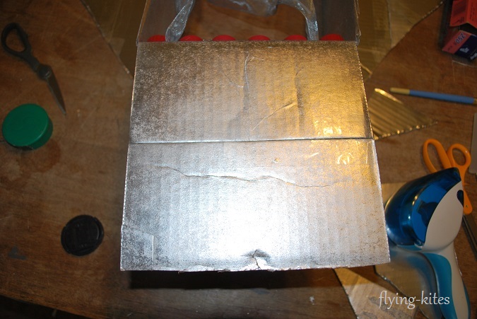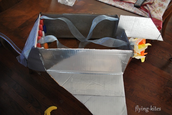 Using the last small cut piece, attach it to the front of the rocket (that small flap) using packing tape.