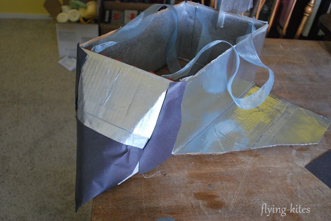 Make the wings by lining up the cut long piece with the attached long piece. Starting at the attached corner closest to the front, make a diagonal cut. Tape the two pieces together with the packing tape. Do the same with the other wing.